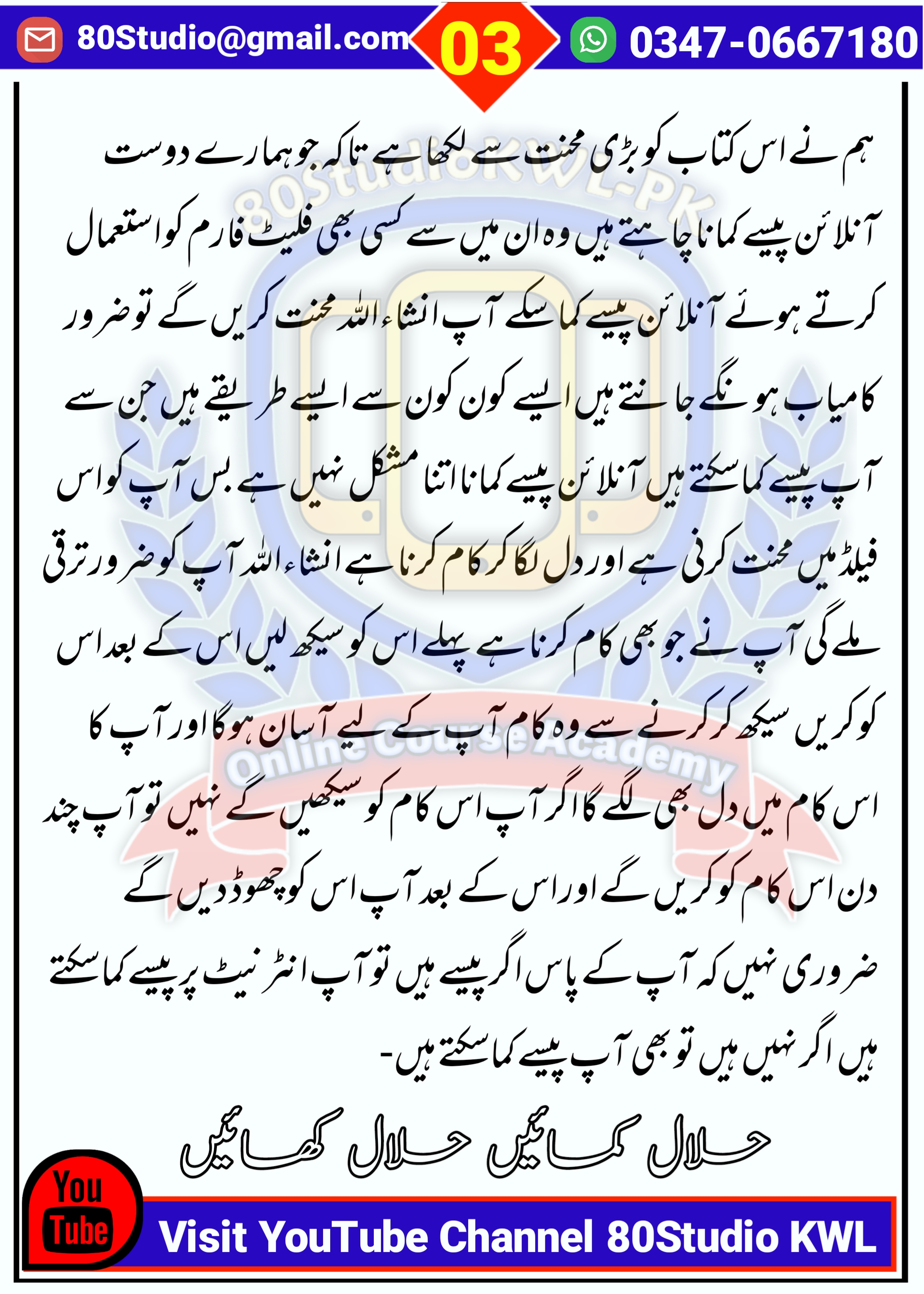 "50 Online Earning Ideas: Apna Financial Freedom Hasil Karain! Ek comprehensive guide jo aap ko 50 legitimate online earning ideas se familiar karata hai. Is kitab mein aap seekhain gay: - Freelancing - Affiliate marketing - E-commerce - Online tutoring - Surveys aur gig economy jobs Aur bhi bahut kuch. Aaj hi apna online earning journey shuru karein!"